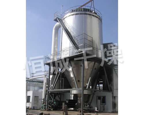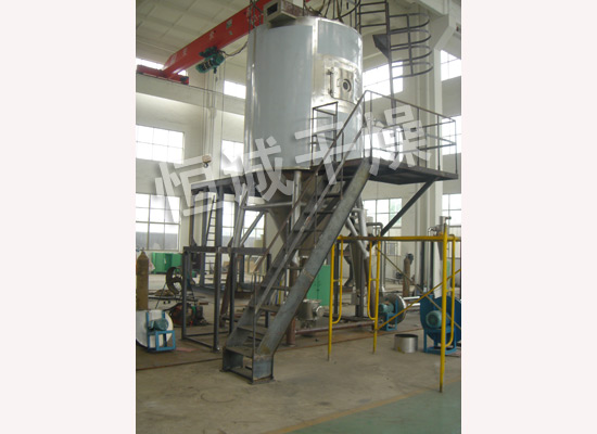 空氣經過濾和加熱,進入幹燥器頂部空氣分配器,熱空氣呈螺旋狀均勻地進入幹燥室。料液經塔體頂部的高速離心霧化器,(旋轉)噴(pen)霧(wu)成(cheng)極(ji)細(xi)微(wei)的(de)霧(wu)狀(zhuang)液(ye)珠(zhu),與(yu)熱(re)空(kong)氣(qi)並(bing)流(liu)接(jie)觸(chu)在(zai)極(ji)短(duan)的(de)時(shi)間(jian)內(nei)可(ke)幹(gan)燥(zao)為(wei)成(cheng)品(pin)。成(cheng)品(pin)連(lian)續(xu)地(di)由(you)幹(gan)燥(zao)塔(ta)底(di)部(bu)和(he)旋(xuan)風(feng)分(fen)離(li)器(qi)中(zhong)輸(shu)出(chu),廢(fei)氣(qi)由(you)風(feng)機(ji)排(pai)空(kong)。