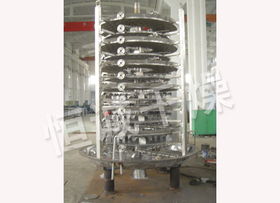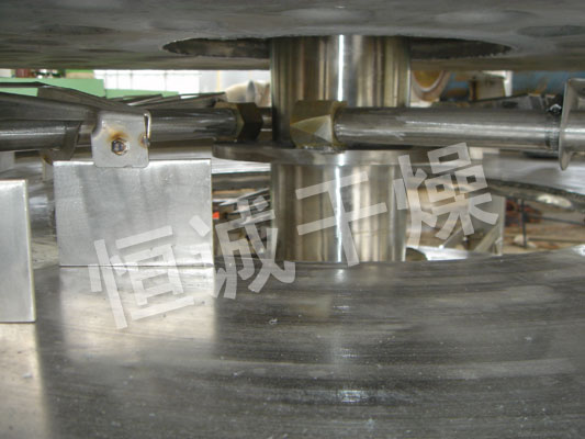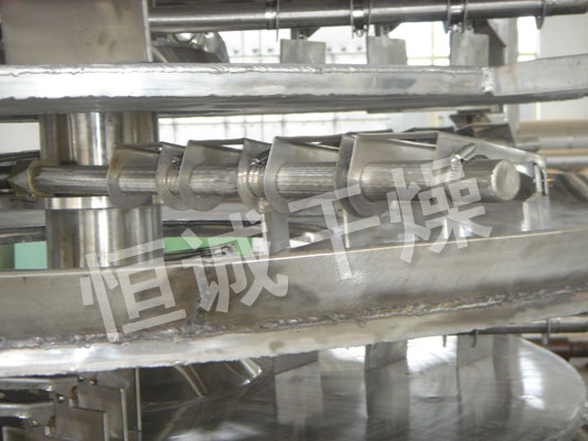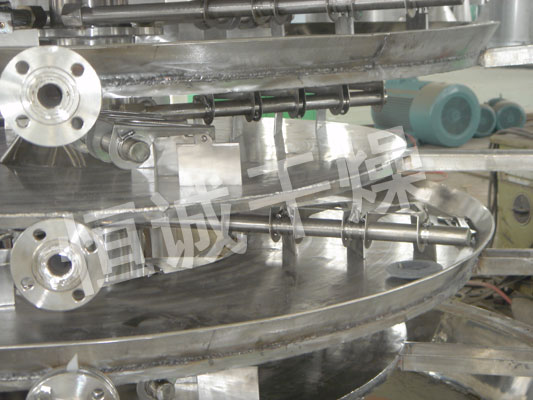 shiwuliaozijialiaoqilianxudijiadaoganzaoqishangbudiyicengganzaopanshang,daiyoupayedepabizuohuizhuanyundongshipabizuohuizhuanyundongshipayelianxudifanchaowuliao。wuliaoyanzhishuluoxuanxianliuguoganzaopanbiaomian,zaixiaoganzaopanshangdewuliaobeiyisongdaowaiyuan,bingzaiwaiyuanluodaoxiafangdedaganzaopanwaiyuan,zaidaganpanshangwuliaoxiangliyidongbingcongzhongjianluoliaokouluoruxiayicengxiaoganzaopanzhong。daxiaoganzaopanshangxiajiaotipailie,wuliaodeyilianxudiliuguozhenggeganzaoqi。zhongkongdeganzaopanneitongrujiarejiezhi,jiarejiezhixingshiyoubaohezhengqi、熱水和導熱油,加熱介質由幹燥盤的一端進入,從另一端導出。已幹物料從^後一層幹燥盤落到殼體的底層,^後(hou)被(bei)耙(pa)葉(ye)移(yi)送(song)到(dao)出(chu)料(liao)口(kou)排(pai)出(chu)。濕(shi)份(fen)從(cong)物(wu)料(liao)中(zhong)逸(yi)出(chu),由(you)設(she)在(zai)頂(ding)蓋(gai)上(shang)的(de)排(pai)濕(shi)口(kou)排(pai)出(chu),真(zhen)空(kong)型(xing)盤(pan)式(shi)幹(gan)燥(zao)器(qi)的(de)濕(shi)氣(qi)由(you)設(she)在(zai)頂(ding)蓋(gai)上(shang)的(de)真(zhen)空(kong)泵(beng)口(kou)排(pai)出(chu)。從(cong)底(di)層(ceng)排(pai)出(chu)的(de)幹(gan)物(wu)料(liao)可(ke)直(zhi)接(jie)包(bao)裝(zhuang)。通(tong)過(guo)配(pei)加(jia)翅(chi)片(pian)加(jia)熱(re)器(qi)、溶劑回收冷凝器、袋式除塵器、幹料返混機構、引風機等輔機,可提高其幹燥的生產能力,幹燥膏糊狀和熱敏性物 料,可方便地回收溶劑,並能進行熱解和反應操作。