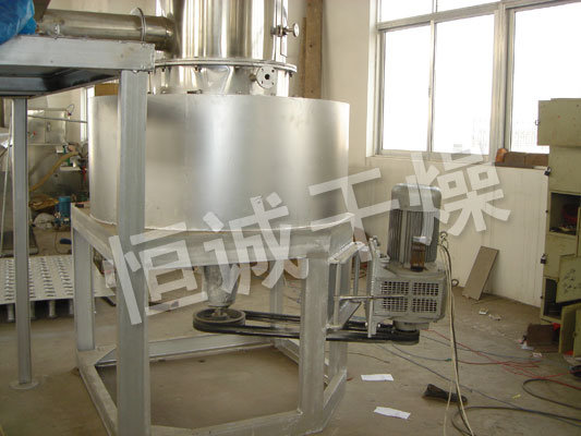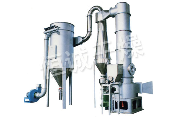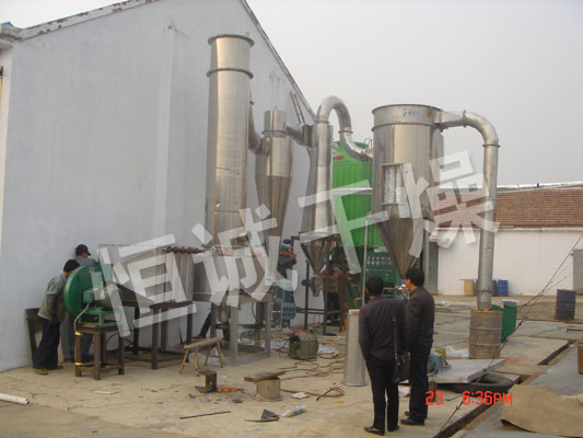 熱re空kong氣qi切qie線xian進jin入ru幹gan燥zao器qi底di部bu,在zai攪jiao拌ban器qi帶dai動dong下xia形xing成cheng強qiang有you力li的de旋xuan轉zhuan風feng場chang。膏gao狀zhuang物wu料liao由you螺luo旋xuan加jia料liao器qi進jin入ru幹gan燥zao器qi內nei,在zai高gao速su旋xuan轉zhuan攪jiao拌ban槳jiang的de強qiang烈lie作zuo用yong下xia,物wu料liao受shou撞zhuang擊ji、磨擦及剪切力的作用下得到分散,塊狀物料迅速粉碎,與熱空氣充分接觸、受熱、幹(gan)燥(zao)。脫(tuo)水(shui)後(hou)的(de)幹(gan)物(wu)料(liao)隨(sui)熱(re)氣(qi)流(liu)上(shang)升(sheng),分(fen)級(ji)環(huan)將(jiang)大(da)顆(ke)粒(li)截(jie)留(liu),小(xiao)顆(ke)粒(li)從(cong)環(huan)中(zhong)心(xin)排(pai)出(chu)幹(gan)燥(zao)器(qi)外(wai),由(you)旋(xuan)風(feng)分(fen)離(li)器(qi)和(he)除(chu)塵(chen)器(qi)回(hui)收(shou),未(wei)幹(gan)透(tou)或(huo)大(da)塊(kuai)物(wu)料(liao)受(shou)離(li)心(xin)力(li)作(zuo)用(yong)甩(shuai)向(xiang)器(qi)壁(bi),重(zhong)新(xin)落(luo)到(dao)底(di)部(bu)被(bei)粉(fen)碎(sui)幹(gan)燥(zao)。